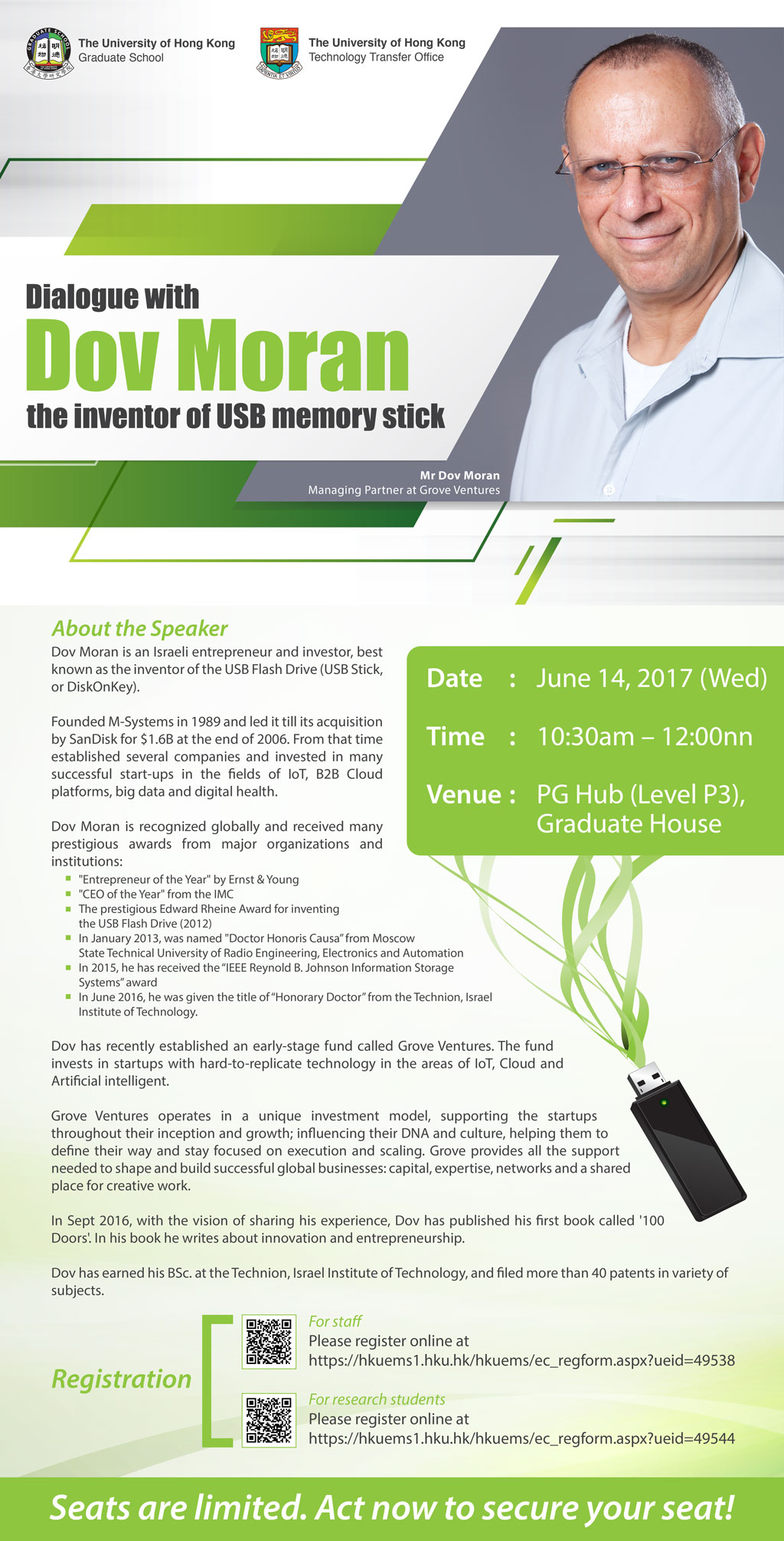 In this session, we wish to offer an opportunity for RPg students, researchers and spin off founders of HKU to participate in an informal and interactive dialogue with Mr Dov Moran, a renowned inventor/entrepreneur/investor who invented the USB memory stick. Participants will gain a better insight in the emerging world of innovation, which represents one of the 3 ‘I’s of HKU – Internationalization, Innovation and Interdisciplinarity.